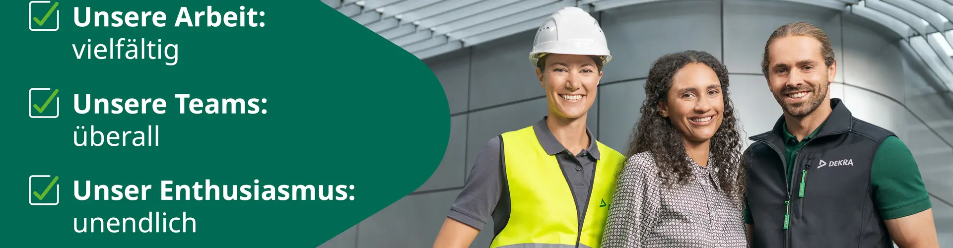 Bei DEKRA stehen Zukunftsthemen in allen Arbeitsbereichen im Mittelpunkt: von der Fahrzeugprüfung bis zur Cybersicherheit, von der Produktprüfung bis zu sauberen Energien oder vom automatisierten Fahren bis zur künstlichen Intelligenz. Wir stellen uns frühzeitig auf neue technische Entwicklungen ein und sorgen branchenübergreifend in 60 Ländern mit rund 48.000 Mitarbeitenden für Sicherheit.